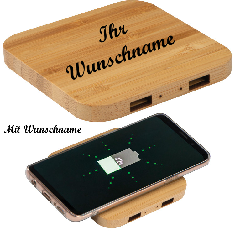 Wireless Charger mit Namensgravur - aus Bambus mit 2 USB-Hubs
